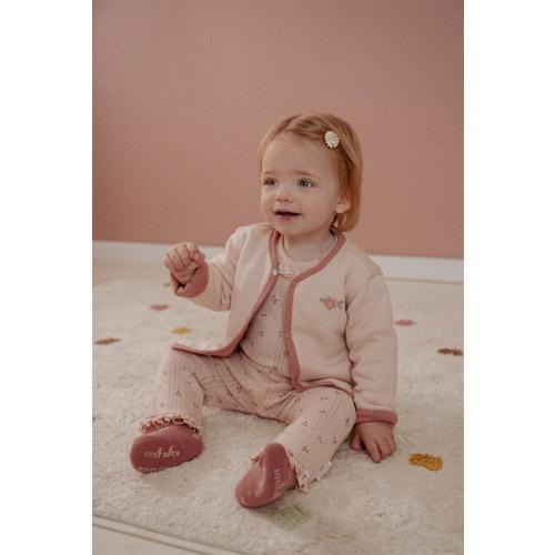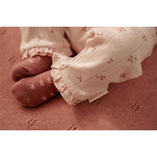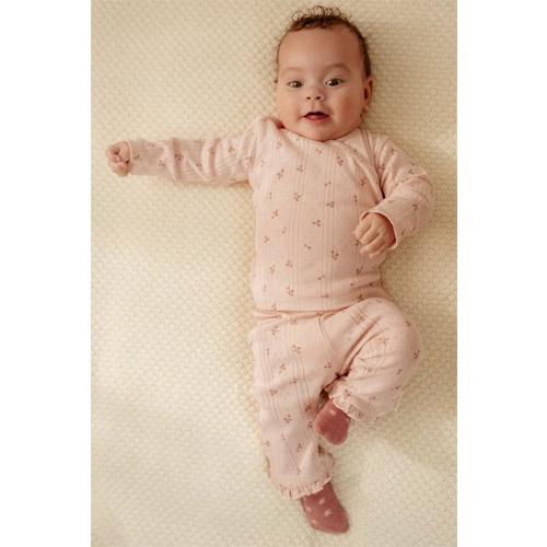 The intricate pointelle structure of the fabric, in a lovely light shade of pink, is adorned with a delightful print of petite flowers.