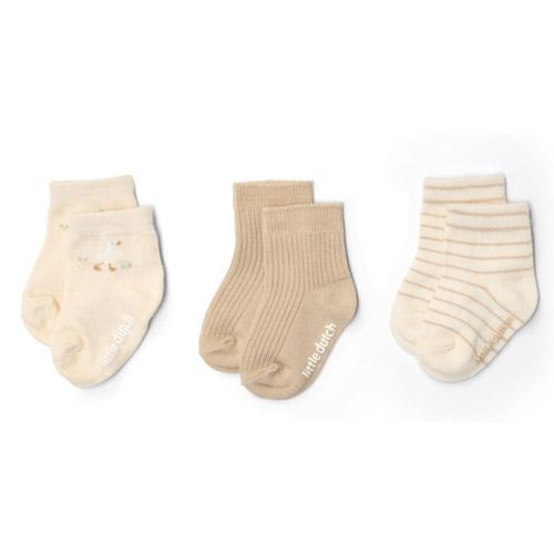 A sand-colored pair with a Little Goose, a soft beige pair, and a striped pair.