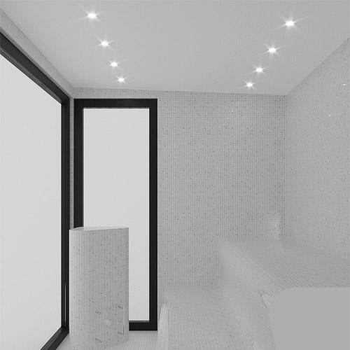 Interior finish: walls, bench, freestanding unit, and pedestal in rigid EPS foam tiled with Ezarri mosaic.