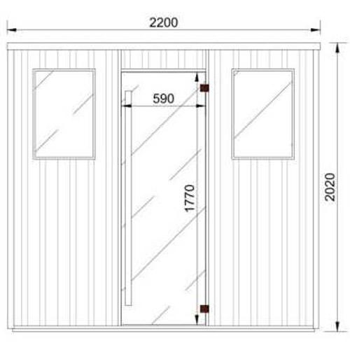 - Tinted safety glass door 1770 mm x 590 mm x 8 mm with brown hinges and cedar handle, 2 windows in tinted safety glass.