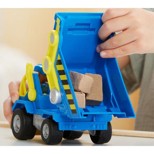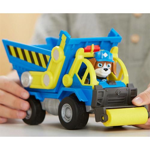 This toy figure and vehicle set includes a 2-inch Wheeler action figure dressed in his official Rubble & Crew uniform. When it's time for action, click Wheeler into the driver's seat and push him down for exciting light and sound effects from the show. Fill the dump truck with materials, lift the bucket to dump the contents, and compact the ground with the compactor, just like Wheeler does in the show.