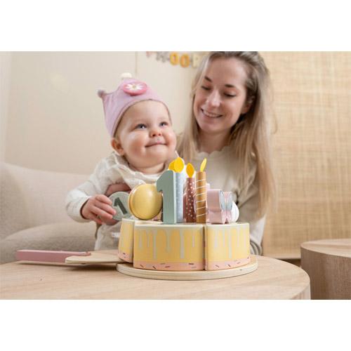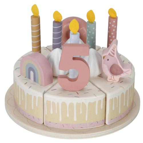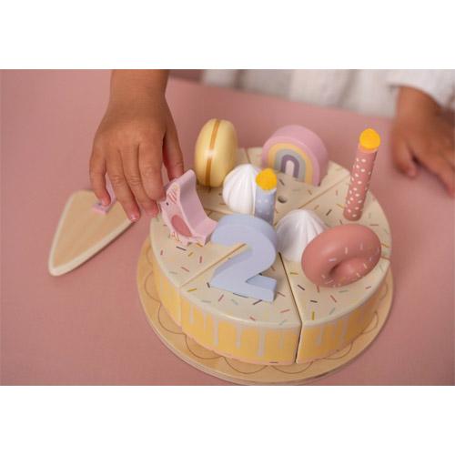 The set consists of six pieces of cake on a tray, a cake server, donut, macaron, bird, butterfly, rainbow, candles, whipped cream tufts and number toppers (1-5).