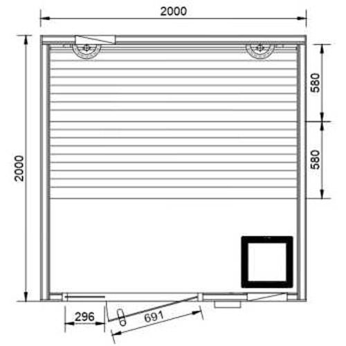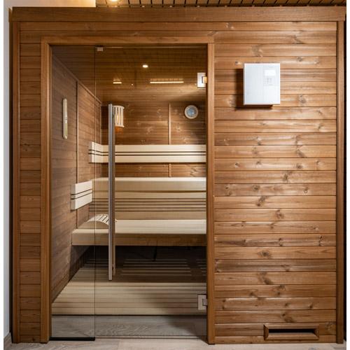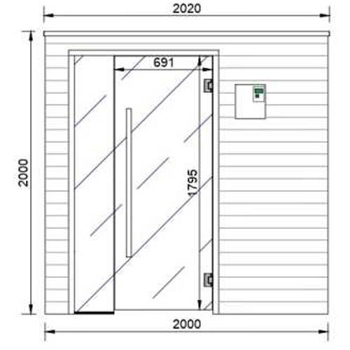- Porte vitrée en verre trempé clair 1795 mm x 691 mm x 8 mm, avec charnières chromées et poignée verticale en acier inoxydable et bois.