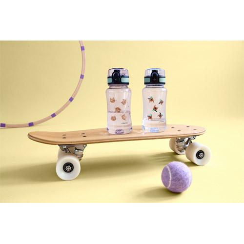 De fles neemt kinderen mee op een ontdekkingsreis met kleurrijke motieven.