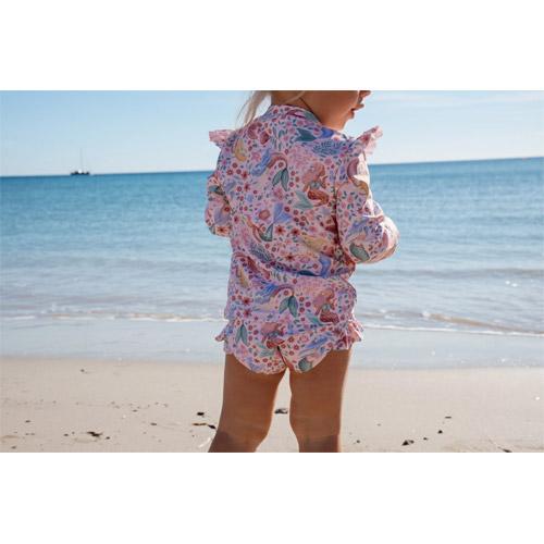 The graceful ruffles on the shoulders of the shirt and on the swimming shorts provide a playful, girly finish that perfectly complements this dreamy print.