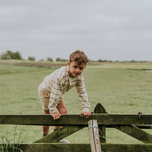 Confectionné dans un beige doux à rayures horizontales couleur sable clair, il offre un style à la fois classique et ludique.