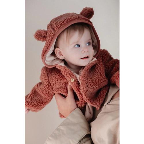 Het is net zo warm als comfortale en heeft een pink blush teddy stof met lieve oren op de capuchon.