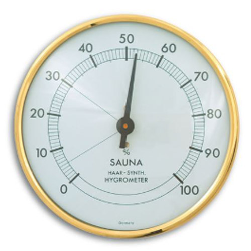 HYGROMETER: Meet instrument voor het meten van de  luchtvochtigheid. Dit betekent de % verhouding tussen de absolute en de maximale vochtigheid. Bij verhoging van de temperatuur zal, bij gelijkblijvende absolute vochtigheid, de relatieve vochtigheid dalen. Binnenin de hygrometer wordt gebruik gemaakt van de eigenschap van haren, welke bij water opname uitzetten en bij water afgifte gaan krimpen. In moderne instrumenten wordt daarvoor ook een kunststof weefsel met dezelfde eigenschappen genomen. Door het combineren van een hygrometer en een thermometer, waarbij de beide wijzers elkaar gaan kruisen, ontstaat een "klimaatmeter" waarmee dan ook het dauwpunt kan worden vastgesteld.