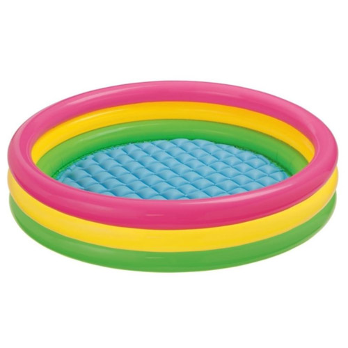Plezant opblaasbaar kinderzwembad van Intex in meerdere kleuren, eenvoudig op te zetten en te vullen, zo kunnen de kids afkoelen en ravotten in uw tuin.
