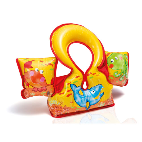 Veiligheidsjas voorzien van opblaasbare mouwen en borststuk zodat kinderen die nog niet kunnen zwemmen veiliger in het water kunnen spelen.