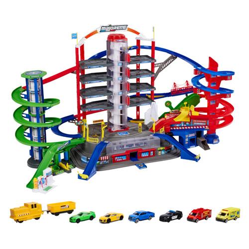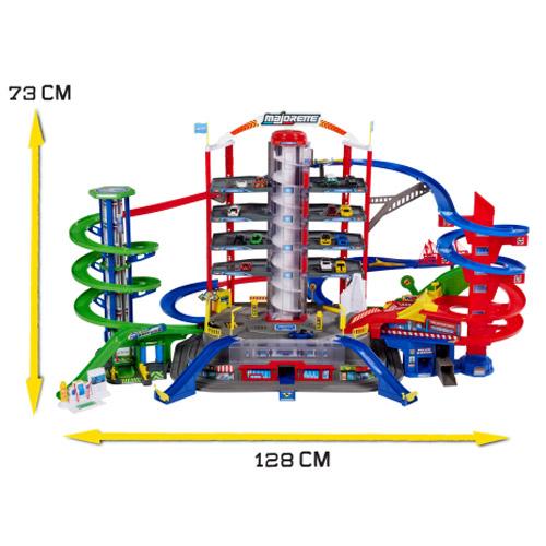 De hoogtepunten zijn de indrukwekkende afmetingen van 128 cm x 78 cm x 73 cm, de zes verschillende licht -en geluidseffecten, zes die- cast voertuigen, zeven niveaus en een batterij aangedreven trein met wagon.