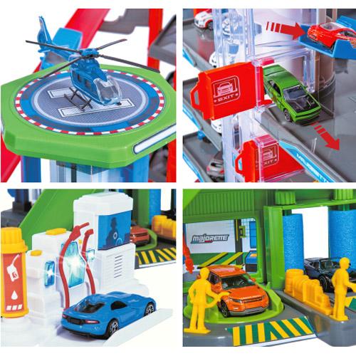 Parkeer alle auto's in deze Majorette Super City garage, breng ze omhoog en omlaag met de lift.