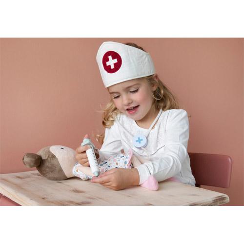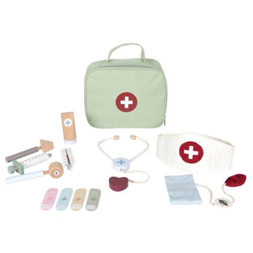 Set bestaat uit: een dokterstas, 4 pleisters, thermometer, spuitje, tube zalf, stethoscoop, reflexhamer, bloeddrukmeter, otoscoop, en doktersmutsje.