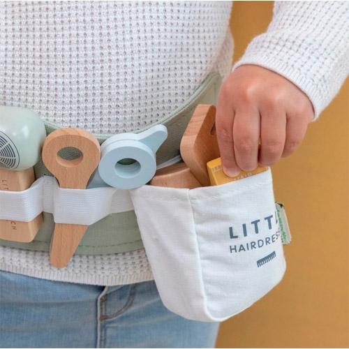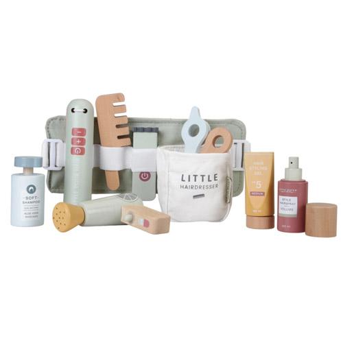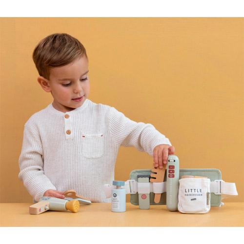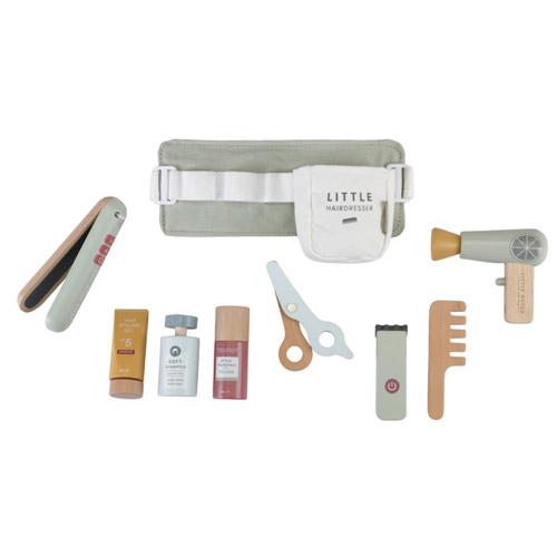 Deze houten set met benodigdheden voor het kappersvak bevat een speelgoedschaar, föhn, stijltang, tondeuse, kam, shampoo, haarlak en stylinggel.