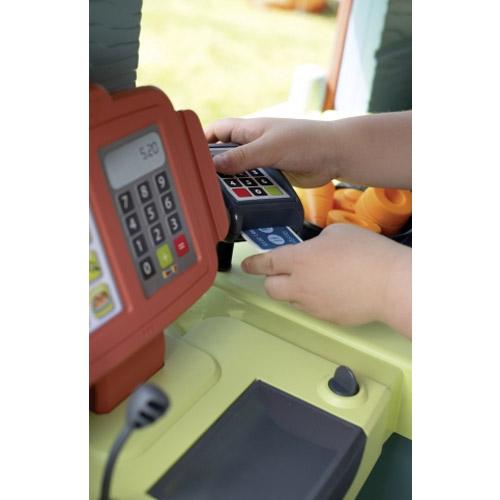 Er zijn veel speelfuncties inbegrepen: 1 koelkast, 1 oven, 1 gasfornuis met uittrekbare vlammen, 1 spoelbak met 1 kraan, 1 kassa met kassalade en 1 bankkaartlezer, en 2 opbergplanken om accessoires op te bergen.